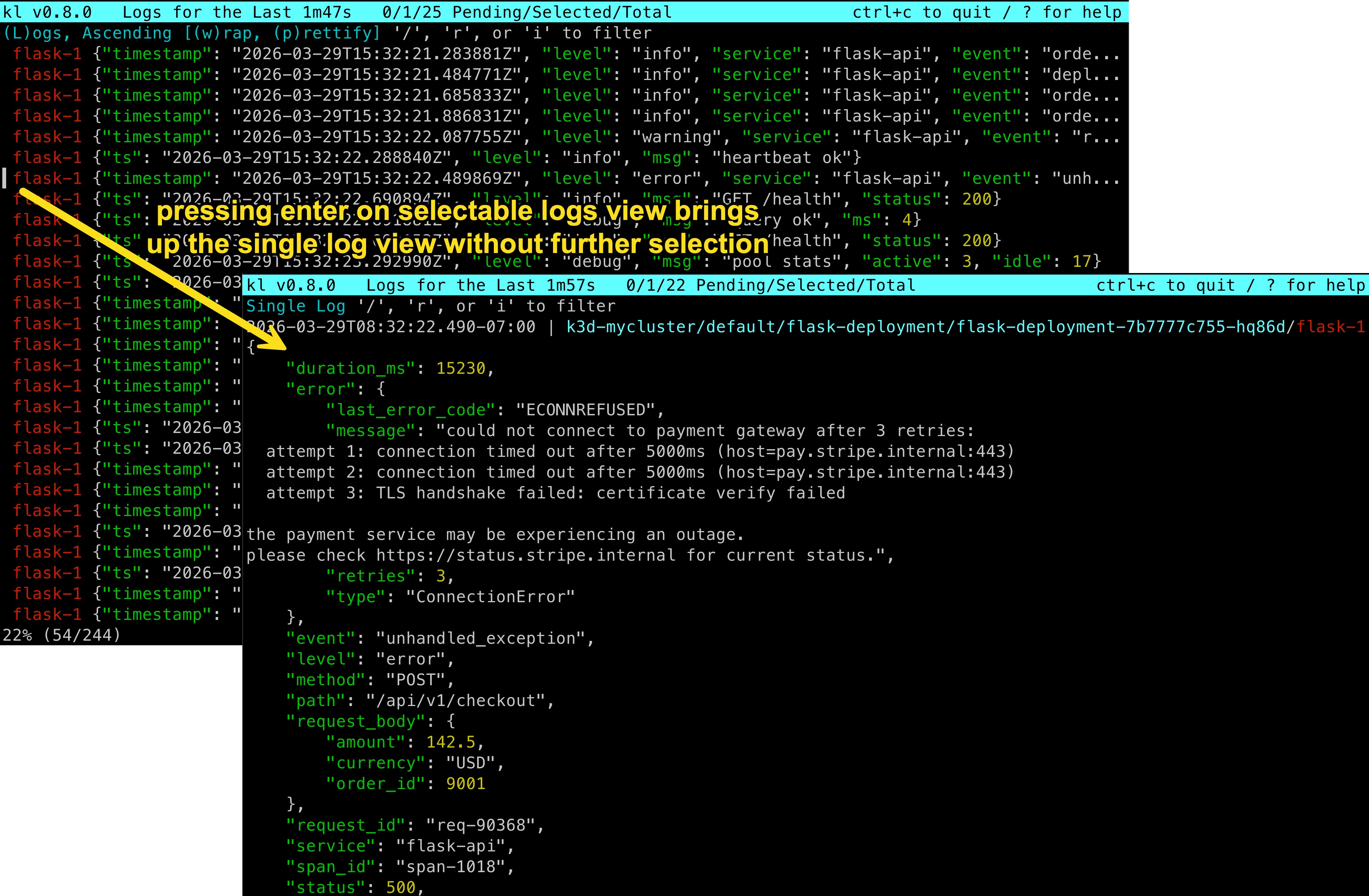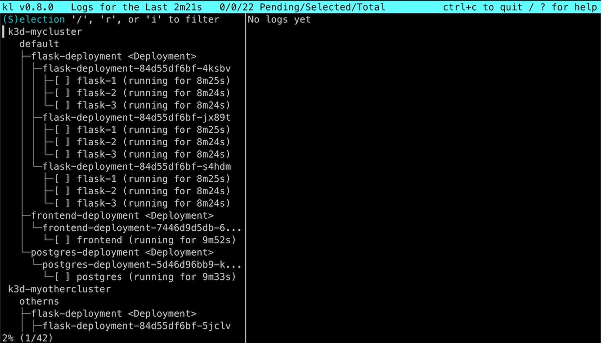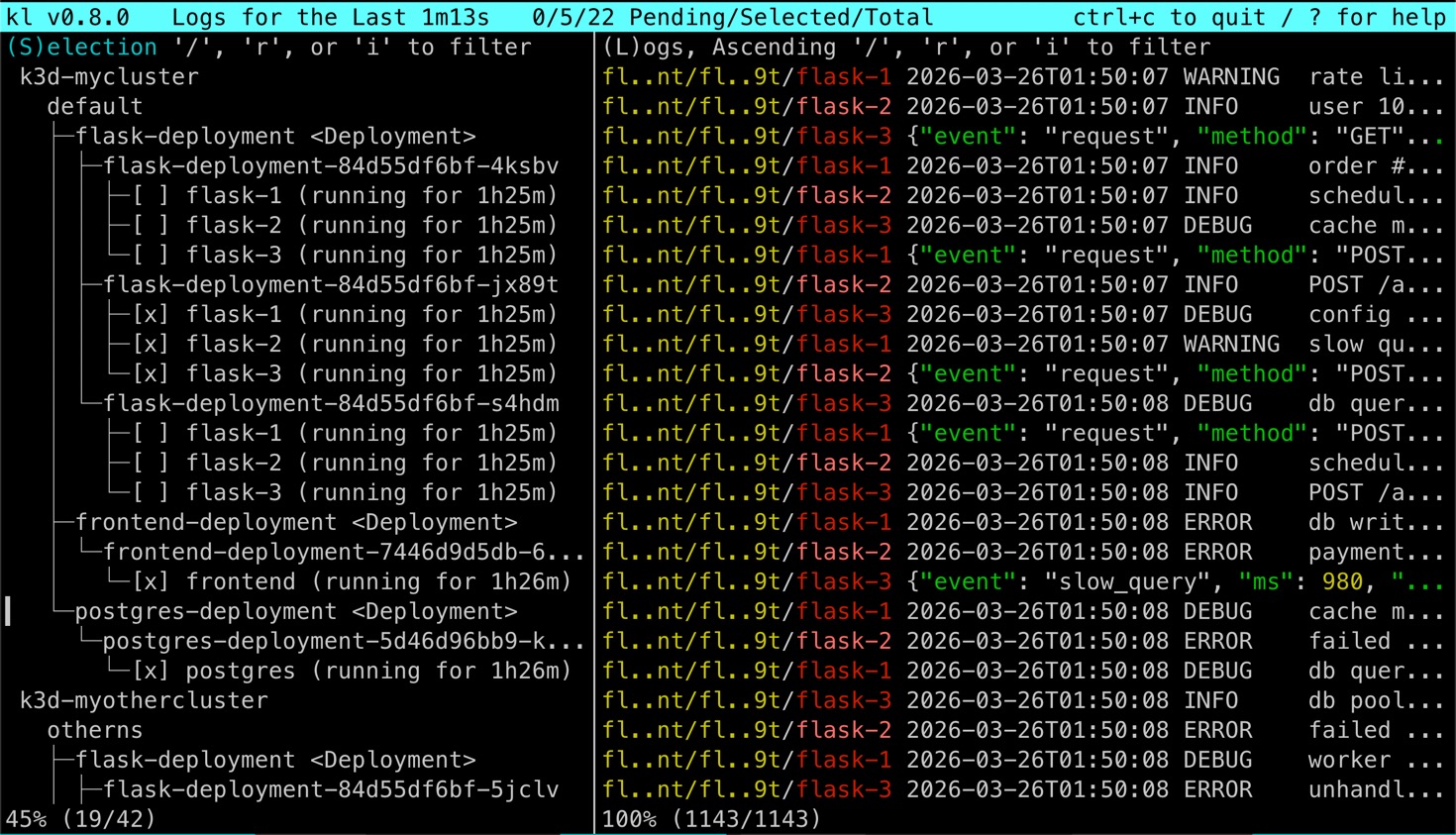 Take kl, a TUI I built for interacting with Kubernetes logs across many clusters and namespaces, for example. On startup, you’re presented with 2 text viewports: a Kubernetes entity hierarchy on the left showing your configured clusters, namespaces, pods, and containers, and an initially-empty view of logs on the right.