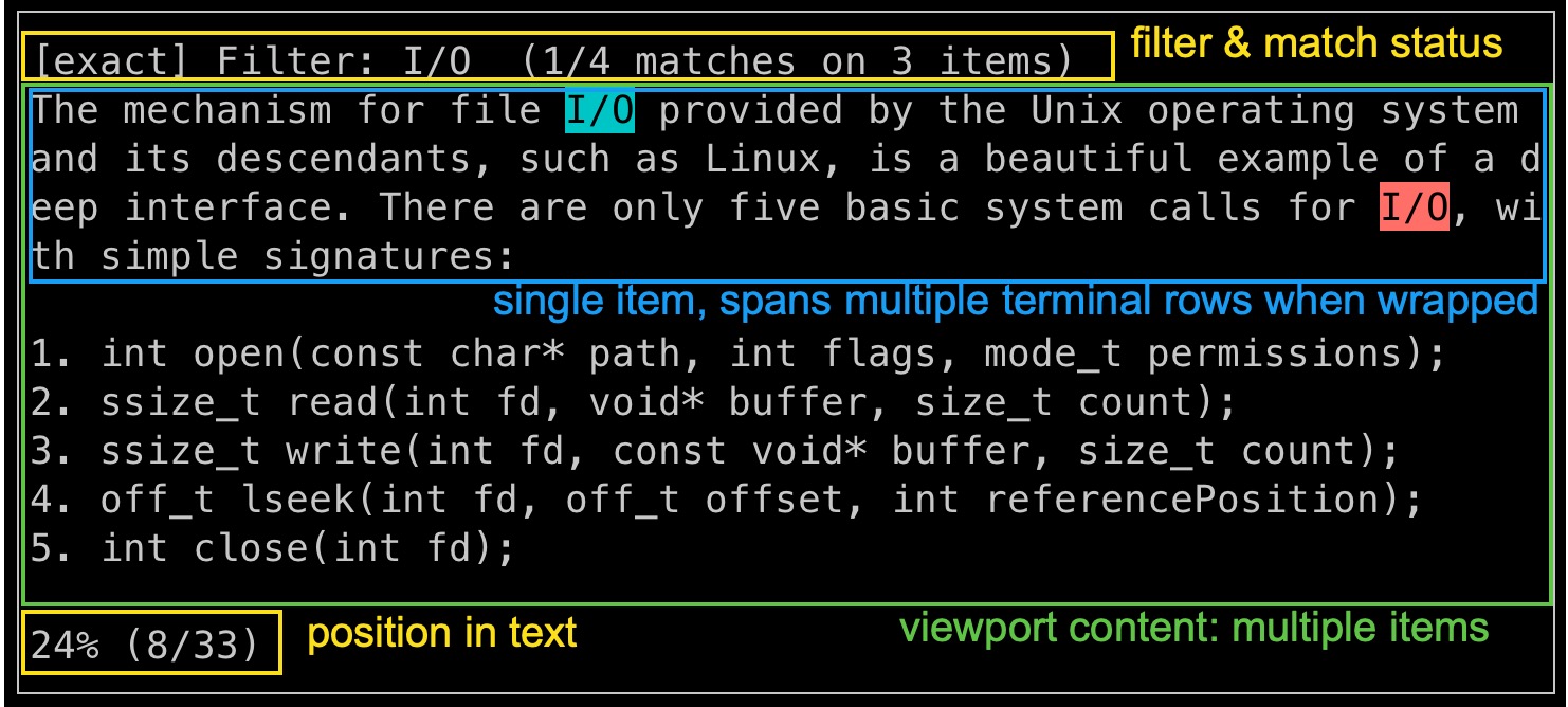 The viewport is a flexibly-sized box with an arbitrary amount of text. This box of text is resizable, scrollable, provides a percentage indicator for your current position in the text, makes text (un)wrappable with horizontal panning when unwrapped, enables search with match navigation, allows for item selection, supports ANSI escape codes for styling text, handles Unicode, and is generally performant even with lots of text.
